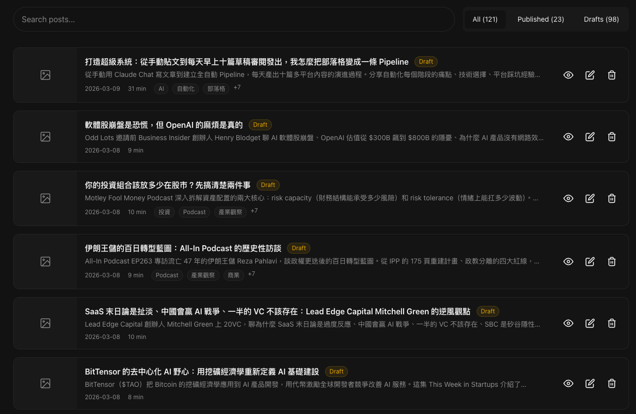 這樣我打開後台的時候,看到的就不是一堆裸文章需要我手動填欄位,而是已經填好所有 metadata 的完整草稿,我只要決定「這篇要不要發」就好。