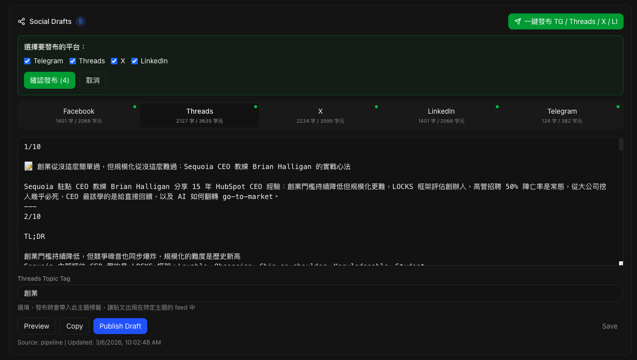 一篇文章要發到 Facebook、X、Threads、LinkedIn、Telegram,每個平台的格式要求都不一樣。手動做的話又是一個地獄循環,所以我也把這塊自動化了。Pipeline 在生成文章的同時,會自動產出五個平台的版本。