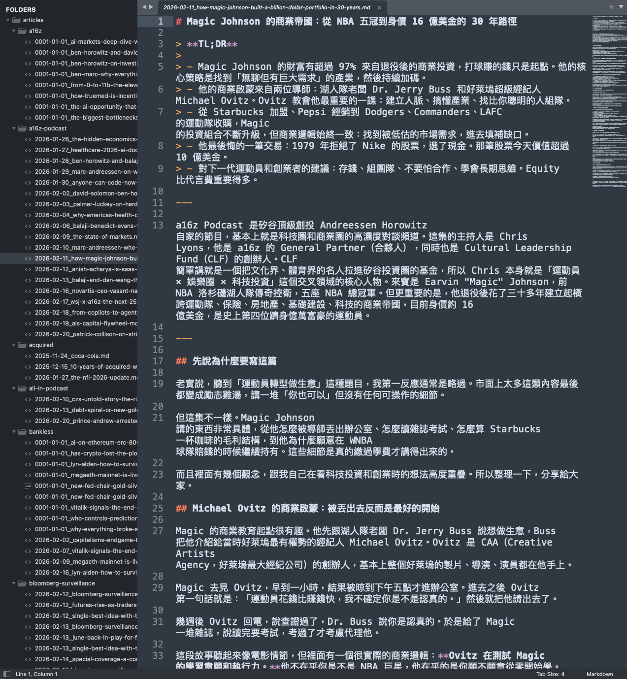但有趣的是,看這些文章我其實看得很開心。因為素材來源的品質本身就很好,這些都是我精挑細選過的 Podcast 和 YouTube 頻道,主持人和來賓的水準都有一定程度,所以 AI 根據逐字稿寫出來的文章,內容深度通常不會太差。再加上 style guide 的約束,寫出來的風格和語氣我大部分也蠻滿意的。翻這些文章的感覺,有點像在逛一個幫你整理好的知識庫。